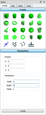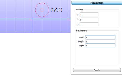 In the Parameters users can type Position (0, 0, 0) and Parameters (width == 4, height == 1, depth == 1) and click Create.