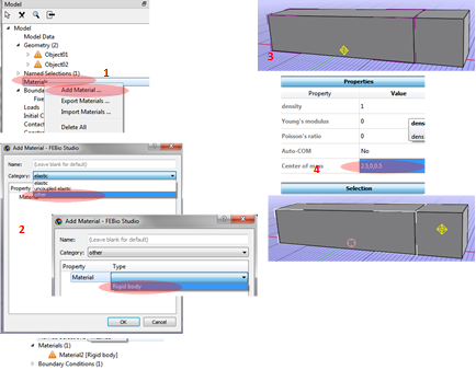 6. Assigning the material of the rigid body. Select Material for the Rigid body and select the second box. Add the selected part to the Selection list.