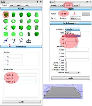 2. Click Mesh panel and applying meshing parameters (Mesh type = Butterfly 2D, Nx = 20, Ny = 20, Nz = 1, Segments =10).