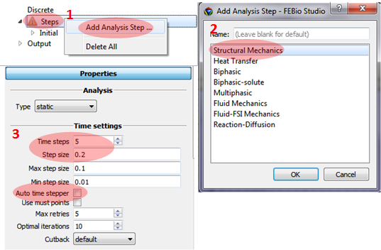 3. Adding parameters for Time settings: Time steps = 5, Step size = 0.2, and unselect Auto time stepper.