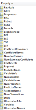 mdl = fitlm(tbl) % using variables in the table or dataset tbl. The last variable: the response variable.